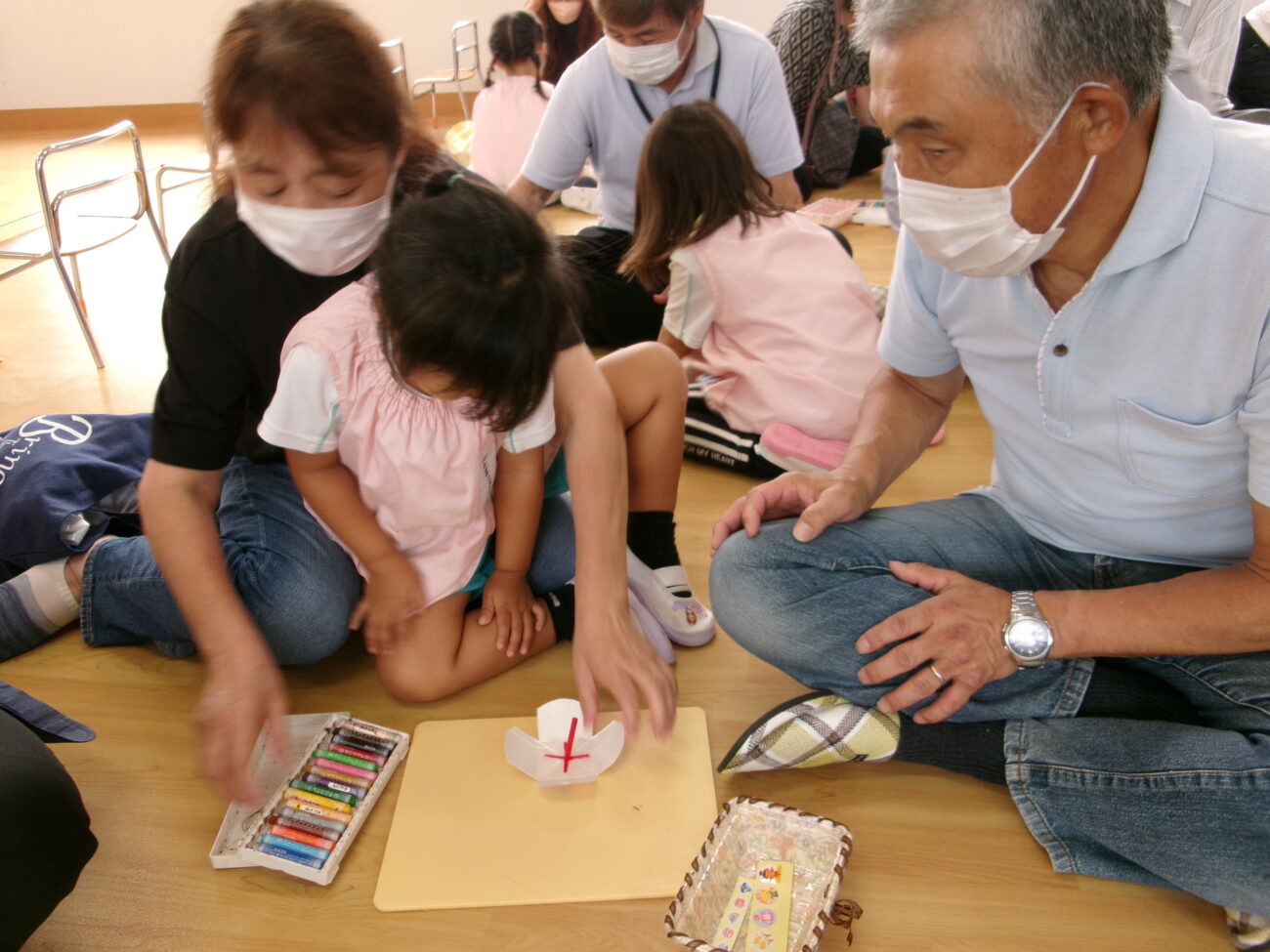 おじいちゃんおばあちゃん、または、お父さんお母さんとコマづくりを楽しんでいる子どもたちの素敵な笑顔が見られました。