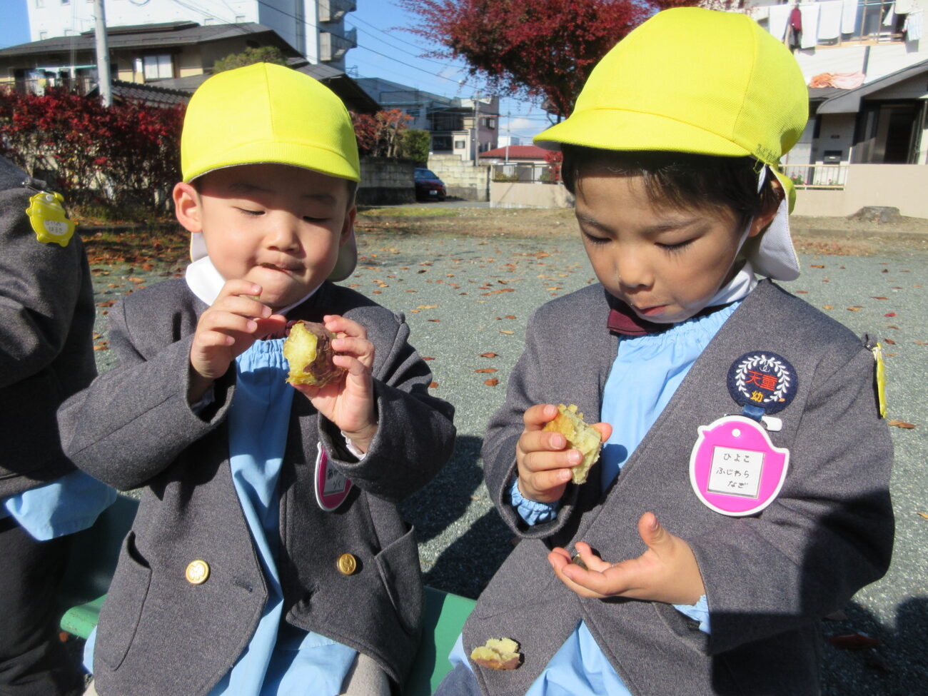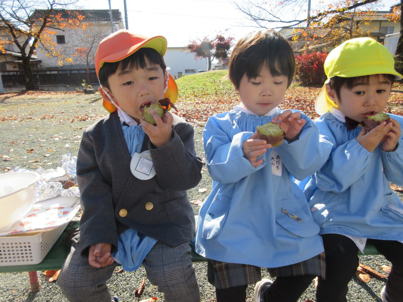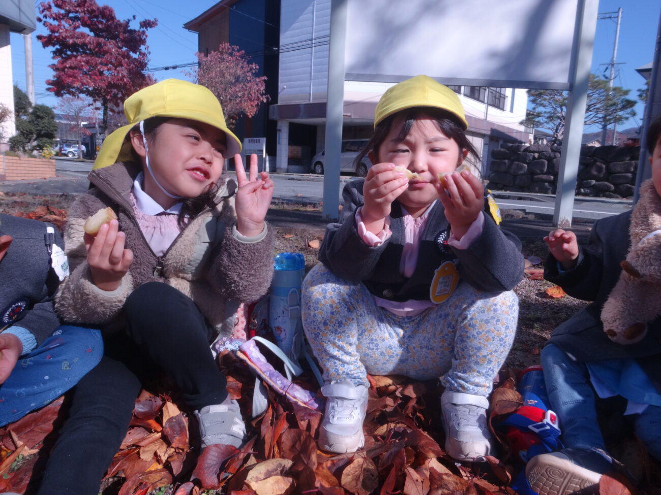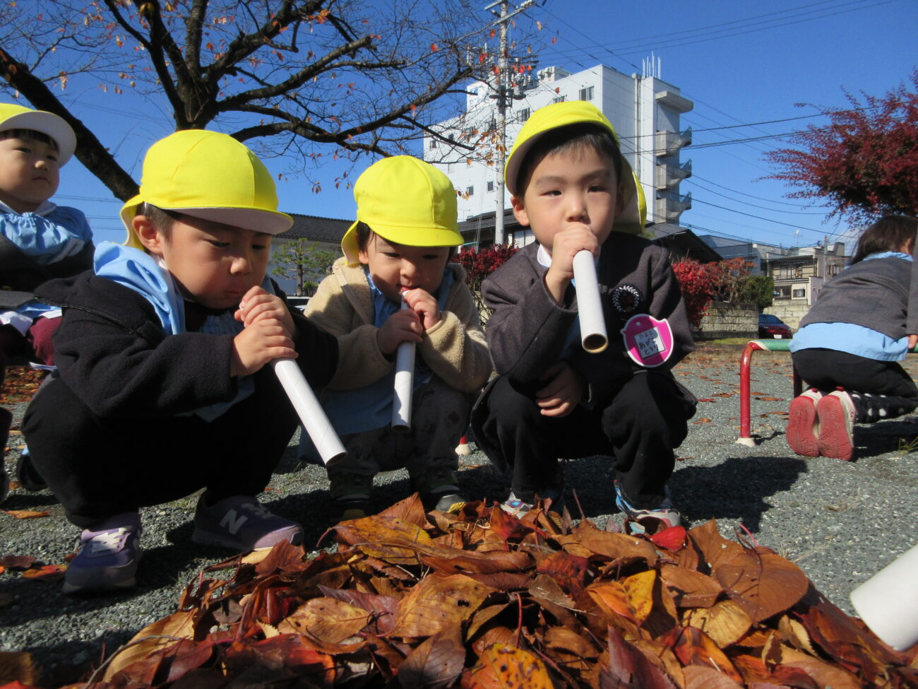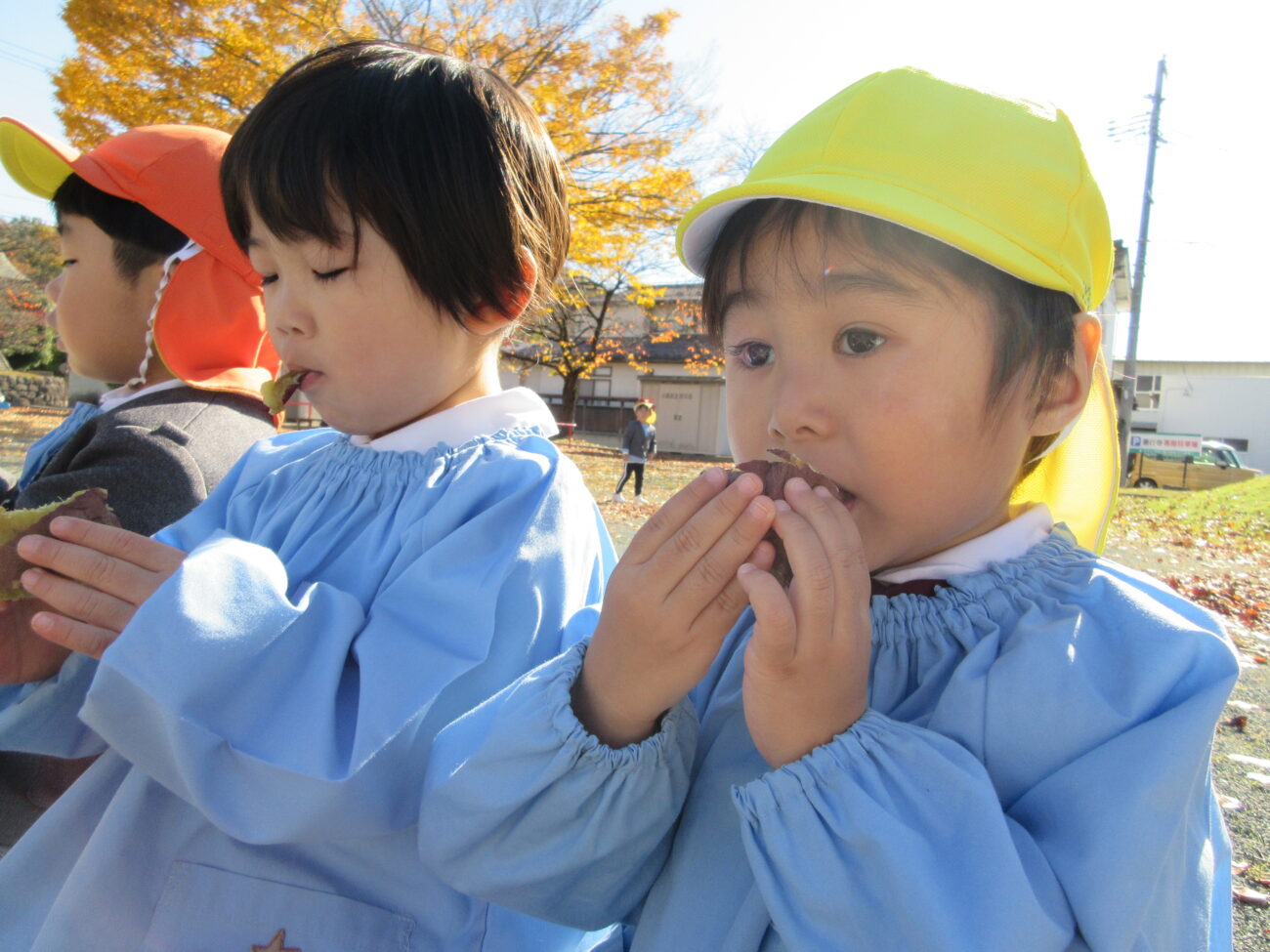 みんなで落ち葉の山を作ったり、クルクルと丸めた棒を使って息を吹きかけ、ホクホク焼き芋を作りました!