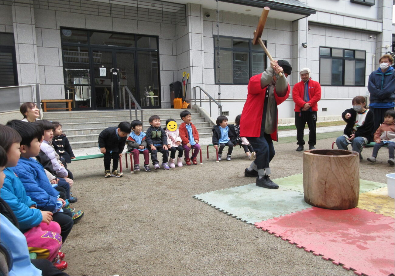 重い杵を持ち、歌「ぺったんぺったんおもちつき~♬」に合わせめいいっぱいつきました!