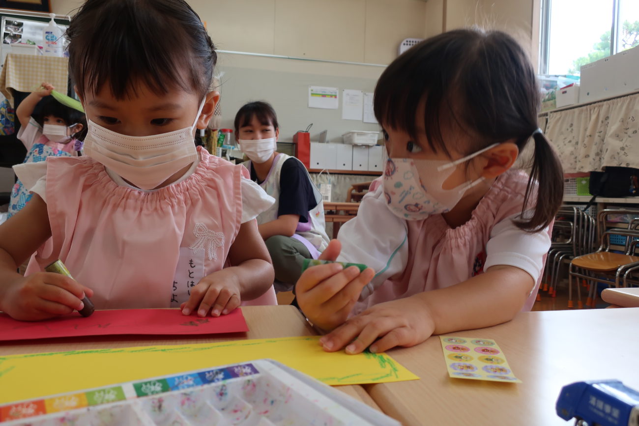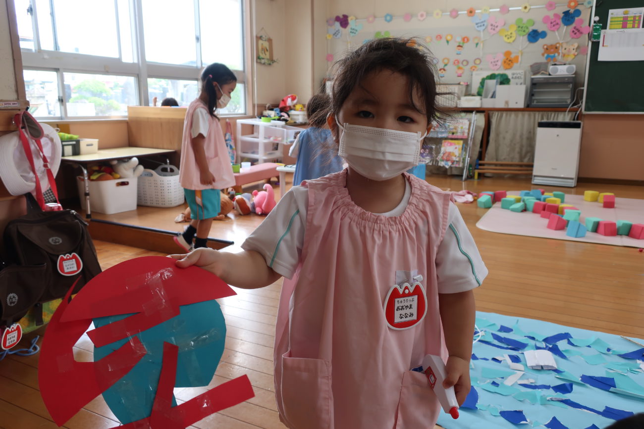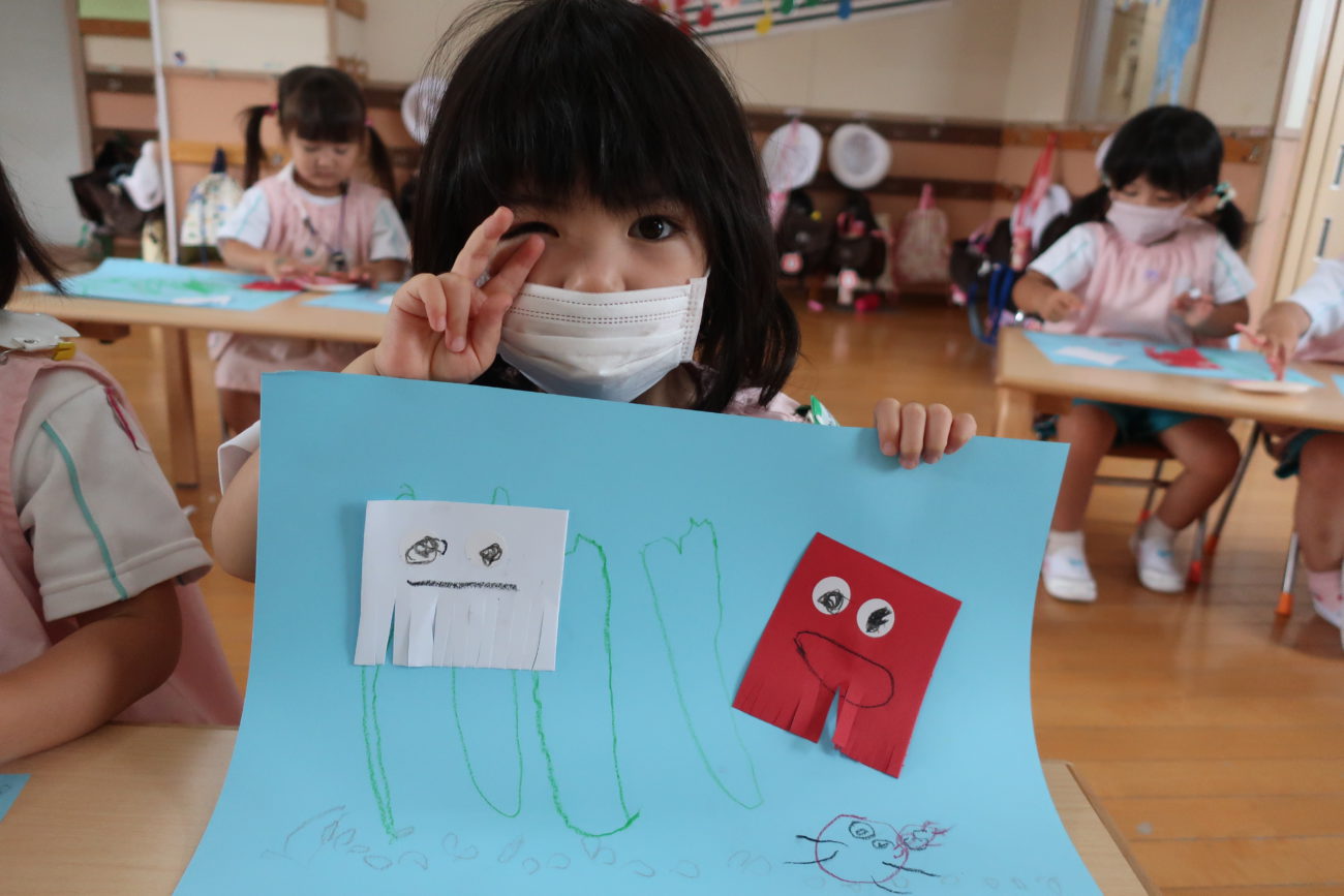 クレヨンで、海の中の石とわかめを描いて、初めて一斉活動でハサミを使った活動をしました✂